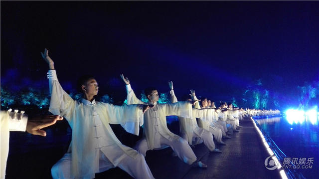 8月10日,塔沟武校210名学员奔赴杭州,开始了文艺演出的紧张排练。为了展示中国武术的博大精深和悠久历史,导演组和塔沟武校的教练员,将陈式、杨式六种太极拳法的精华提炼出来,不断地揣摩演练,最终编创了包含白鹤亮翅、六封四闭、双龙出海、掩手弘拳、双峰贯耳等具有很强观赏性的太极拳法,由80名学员在《高山流水》节目进行演练。