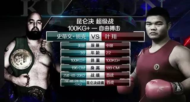 2017年昆仑决 超级战昨晚在三亚震撼上演,其中一场“巨人争霸”格外吸引眼球:塔沟武校叶翔对阵美国“功夫熊猫”史蒂文-班克。结果得偿所愿,叶翔在比赛的第一局31秒,连续狂轰30拳重击史蒂文班克,裁判为保护运动员终止比赛,叶翔KO史蒂文班克获胜!