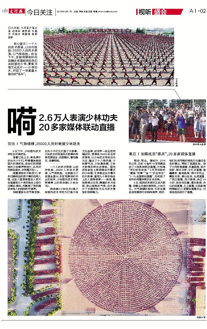 核心提示丨一个人的武术表演,以动作取胜;26000人的武术表演,以气势取胜。昨日下午,全国党媒视听内容融合发展矩阵成员们来到登封少林塔沟武校,聚焦河南文化名片——少林功夫,开启了一场直播大联动的“练兵”。