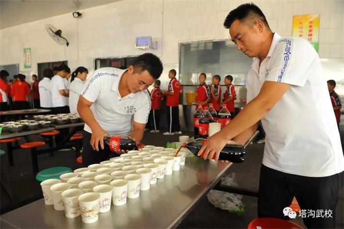 餐厅另一边整整齐齐的就坐的两排学生吸引了大家的目光,只见教练员为每个学生斟满可乐,共同举杯,遥祝远方的爸爸妈妈节日快乐,身体健康万事如意!