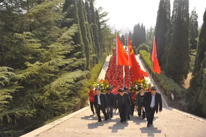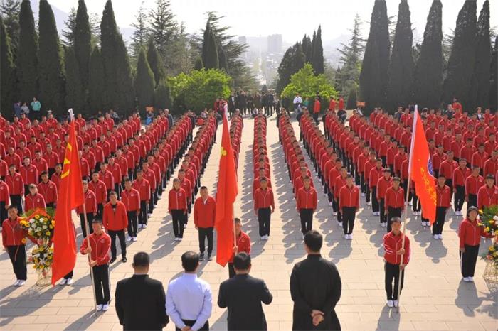 上午8点半,塔沟武校600余名青年团员集合完毕,高举党旗、团旗、校旗,排着整齐的队伍,到登封市烈士陵园,缅怀为祖国解放、人民幸福而英勇奋斗的革命先烈们。