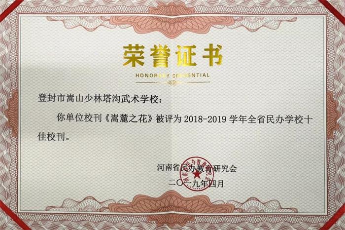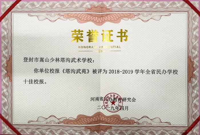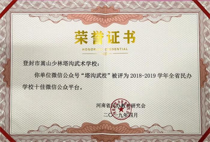 为加强全省民办学校宣传工作,引导民办学校重视利用校报、校刊和新媒体做好对外宣传,河南省民办教育研究会开展了全省民办学校优秀校报、校刊及新媒体评选活动在全省民办学校优秀校报、校刊及新媒体评选活动,登封市嵩山少林塔沟武术学校分别获得全省民办学校十佳校报、十佳校刊、十佳微信公众平台和十佳网站四个奖项。