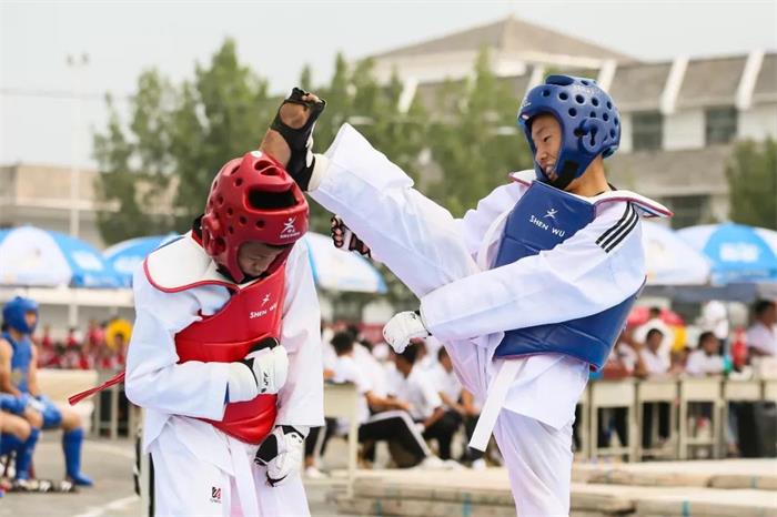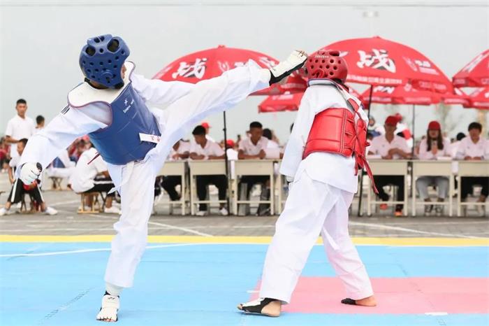 跆拳道场地上的比赛一样精彩,身穿护具的选手们个个腿法了得,有效击打频频命中对手得分。