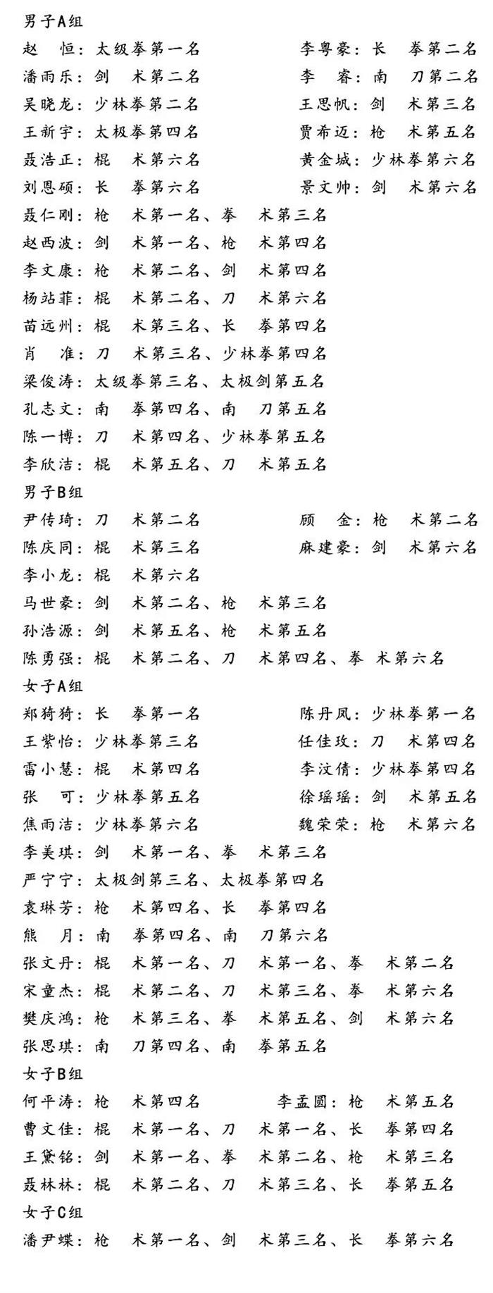 7月26日至30日,河南省武术套路锦标赛在洛阳市新区体育馆举行,共有来自全省各地市的19支代表队526名运动员参赛。我校学员代表郑州、塔沟武校等队参赛,最终获得12个第一名、14个第二名、15个第三名、18个第四名、14个第五名、14个第六名,并代表郑州获得“体育道德风尚奖运动队”荣誉称号。
