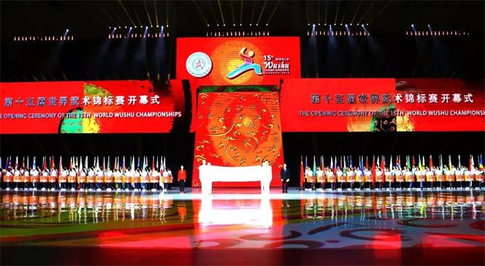 当功夫巨星与“少林”再度相遇,会怎样呢?随着场馆中响起《少林少林》的背景音乐,整个开幕式进入高潮:场馆掌声轰然而起,只见大屏幕上清晰地浮现出嵩山和少林山门,与此同时塔沟小子一套快速整齐的少林拳以及头顶梅花桩上的武术演练扣人心弦,在集体少林棍再度登场之后,国际武联形象大使、武术文化传播者李连杰步入场内,向世界讲述了自己展示、推广中国武术的愿望,号召大家身体力行将武术文化传播的更广更远!
