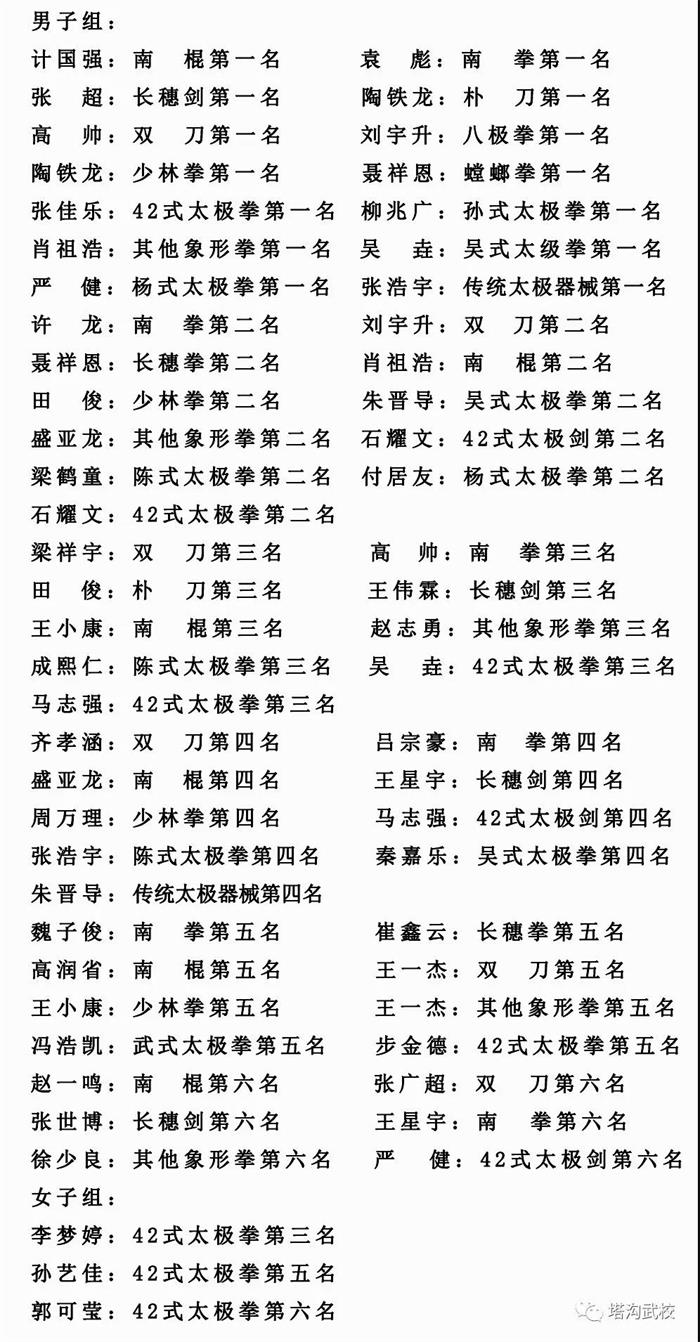 11月9日至11日,2018年河南省传统武术锦标赛在信阳举行,共有来自全省的10支代表队218名运动员参赛。塔沟武校套路队学员参加了比赛,经过三天的争夺,最终获得14个第一名、11个第二名、10个第三名、9个第四名、9个第五名和7个第六名。