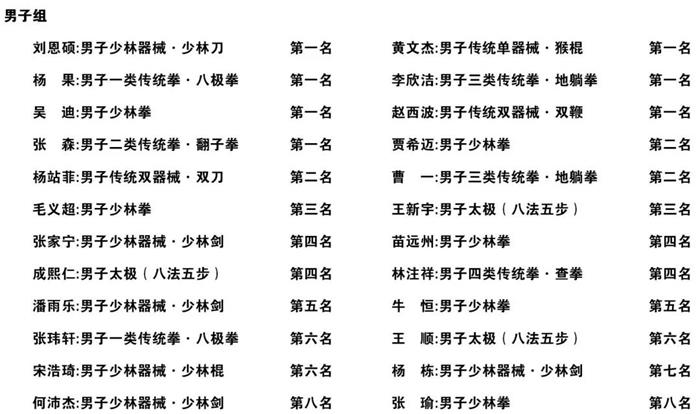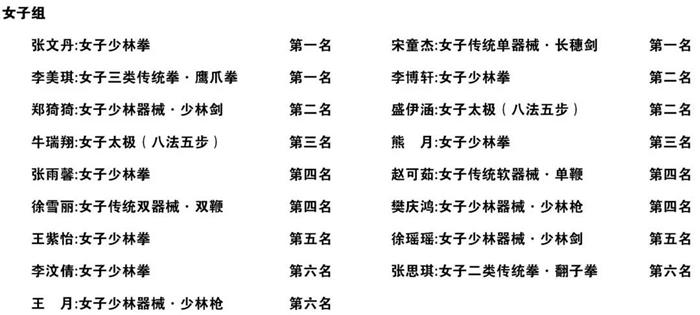 比赛分男女两个组别,设传统拳、传统器械、太极等比赛项目。我校学员代表塔沟武校青少年体育俱乐部等队参加了比赛,最终获得10个第一名、6个第二名、4个第三名、8个第四名、4个第五名、6个第六名、1个第七名,2个第八名,并荣获“体育道德风尚奖运动队”荣誉称号,参赛的43名队员全部进入决赛。
